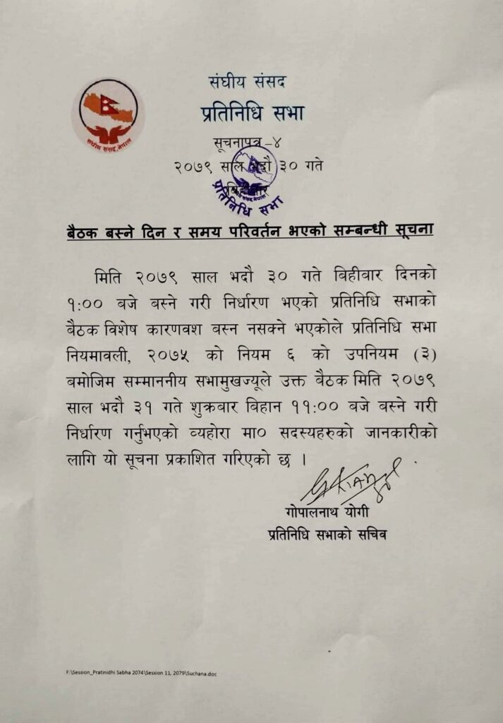 काठमाडौं। प्रतिनिधिसभाको बैठक सारिएको छ । बिहीबार दिउँसो १ बजेका लागि बोलाइएको प्रतिनिधिसभाको बैठक सार्दै शुक्रबार बिहान ११ बजेका लागि तय गरिएको प्रतिनिधिसभाको सचिव गोपालनाथ योगीले जानकारी दिए ।