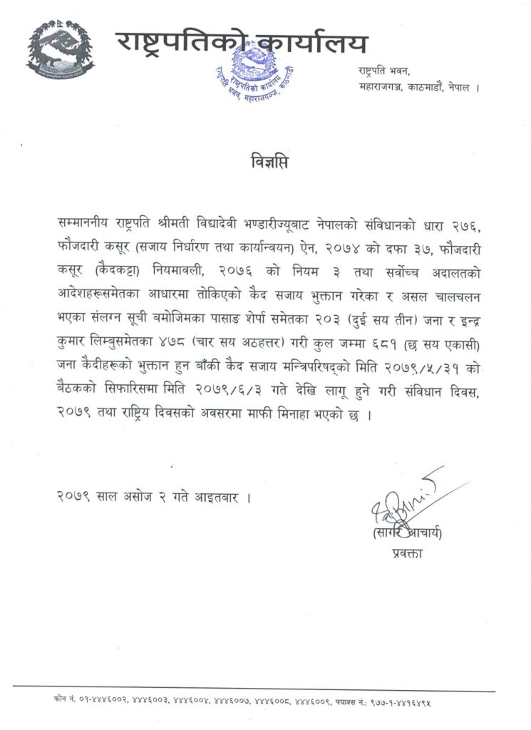 ‘राष्ट्रपति विद्यादेवी भण्डारीबाट नेपालको संविधानको धारा २७६, फौजदारी कसूर (सजाय निर्धारण तथा कार्यान्वयन) ऐन, २०७४ को दफा ३७, फौजदारी कसूर (कैदकट्टा) नियमावली, २०७६ को नियम ३ तथा सर्वोच्च अदालतको आदेशहरूसमेतका आधारमा तोकिएको कैद सजाय भुक्तान गरेका र असल चालचलन भएका संलग्न सूची बमोजिमका पासाङ शेर्पा समेतका २०३ जना र इन्द्र कुमार लिम्बुसमेतका ४७८ गरी कुल जम्मा ६८१ जना कैदीहरूको भुक्तान हुन बाँकी कैद सजाय मन्त्रिपरिषद्को मिति २०७९/५/३१ को बैठकको सिफारिसमा मिति २०७९/६/३ गते देखि लागु हुने गरी संविधान दिवस, २०७९ तथा राष्ट्रिय दिवसको अवसरमा माफी मिनाहा भएको छ,’ प्रवक्ता आचार्यले जारी गरेको विज्ञप्तिमा उल्लेख छ ।