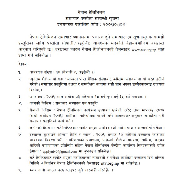 सूचनाअनुसार नेपाली समाचार प्रस्तोता सात र अंग्रेजी समाचार प्रस्तोता तीन गरी १० जना समाचार प्रस्तोता माग गरिएको छ ।