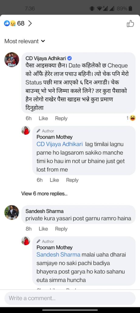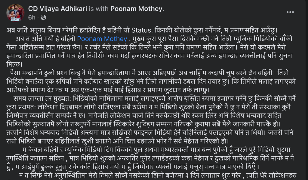 गायक सिडी विजय अधिकारीले भने गीत तथा म्युजिक भिडियो निर्माणको समयमा लेखक तथा निर्माता मोथेले कबुल गरेको रकम समयमै नदिएको बताएका छन्। उनले विभिन्न संघसंस्थाको लोगो प्रयोग गरेको र आर्थिक सहयोग लिएको आरोप गलत रहेको बताएका छन् । उनले रकम लिएको प्रमाणित गर्न मोथेलाई चुनौतीसमेत दिएका छन् ।