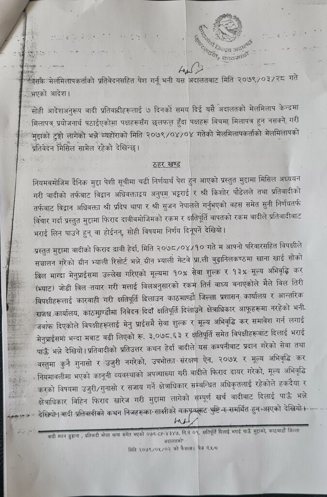 काठमाडौंको बूढानीलकण्ठमा रहेको ग्रिन भ्याली रिसोर्टले मेनुमा उल्लेख भएको मूल्यभन्दा बढी रकम लिएको विषयमा परेको मुद्दामा जिल्ला अदालतले मेनुमा तोकिएको मूल्यका अतिरिक्त सेवा शुल्क बापत १० प्रतिशत र भ्याटबापत १३ प्रतिशत रकम उपभोक्ताबाट असुल गर्न नपाइने फैसला गरेको हो ।