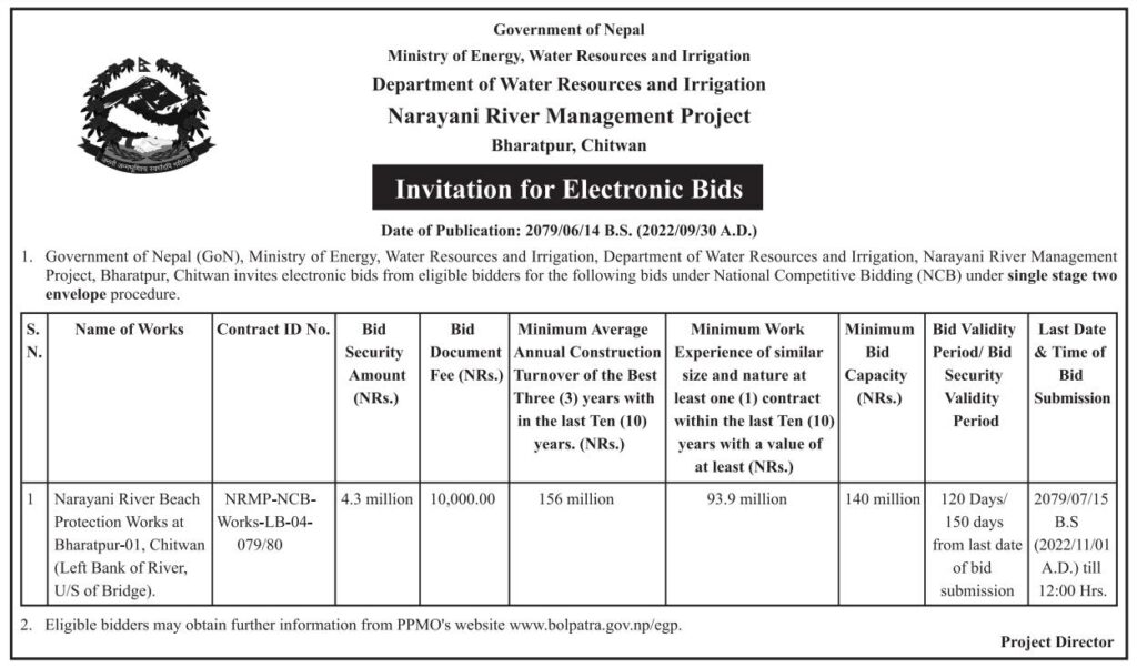 नारायणी नदी व्यवस्थापन कार्यालयले उक्त कार्यको लागि बोलपत्र आह्वान गरेको हो । ठेक्काको लागि कात्तिक १५ गते भित्र विद्युतीय बोलपत्र पेश गरिसक्न सूचनामा भनिएको छ ।