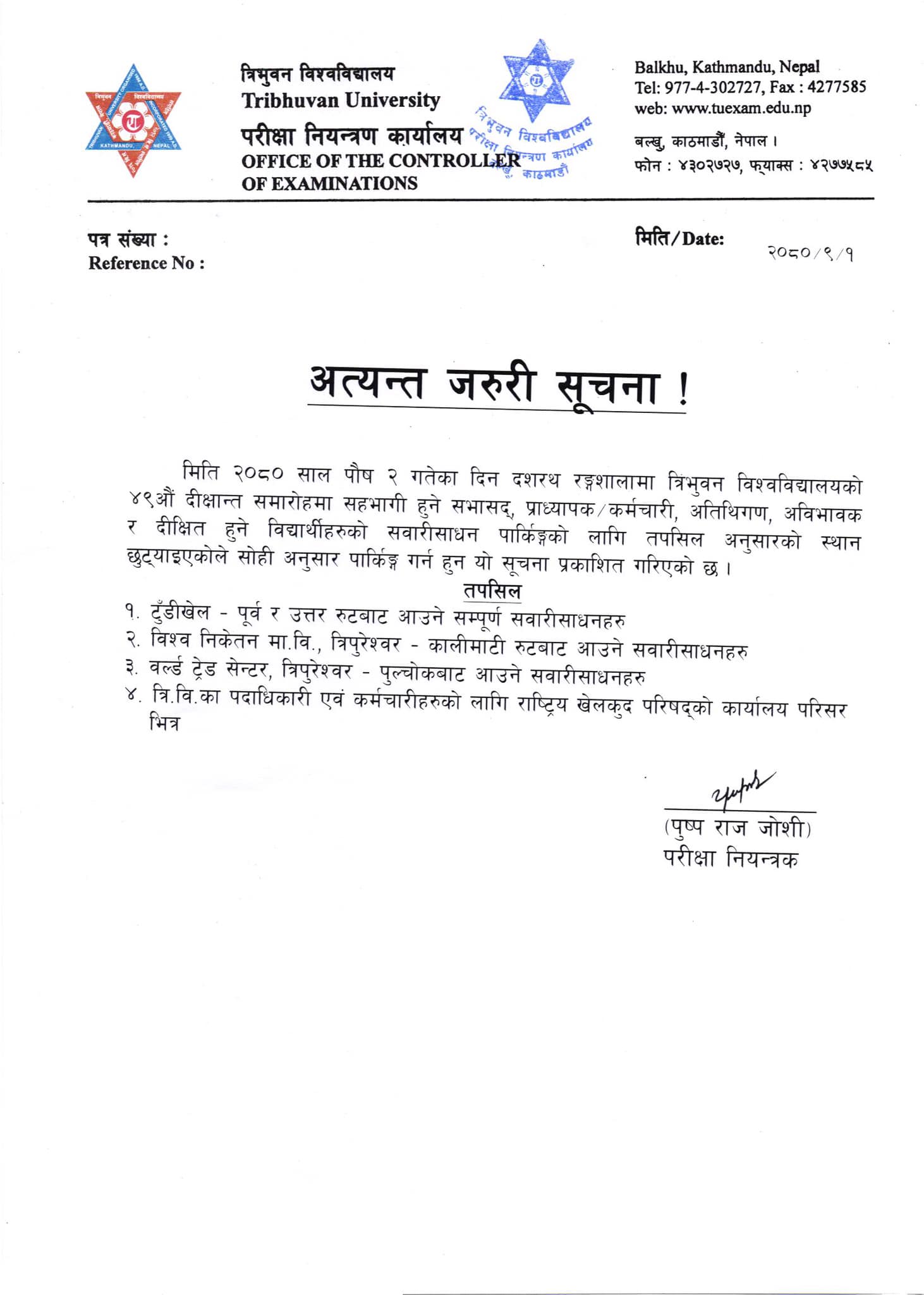 आ–आफ्नो गाउनरस्कार्फरटोपी पहिरी बिहान ८ बजेदेखि १० बजेभित्र समारोह स्थलमा प्रवेश गर्न र तोकिएको स्थानमा बस्न त्रिविले विद्यर्थीलाई अनुरोध गरेको छ। समारोहमा २०७९ असार १ गतेदेखि २०८० जेठ ३२ गते सम्मका स्नातक तहदेखि स्नातकोत्तर तह उत्तीर्ण ७७ हजारभन्दा बढी विद्यार्थी दीक्षित हुनेछन्।