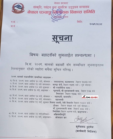 यस वर्ष विजयादशमीको साइत भोलि असोज १९ गते (बुधबार) बिहान ११ः५१ बजे उत्तम रहेको नेपाल पञ्चाङ्ग निर्णायक विकास समितिले जनाएको छ। भोली बिहान १०ः३४ बजे देवी विसर्जन गरी ११ः५१ बजेको साइतमा मान्यजनबाट देवीको प्रसादका रूपमा टीका लगाउन सकिने समितिले जनाएको छ।