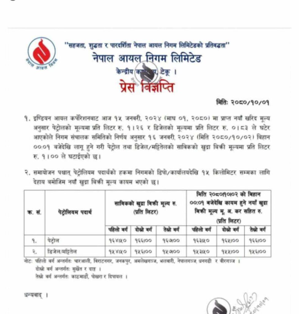 सोमबार इन्डियन आयल कर्पोरेसनबाट मूल्य घटेर आएपछि निगमले मंगलबार बिहान १ बजेदेखि लागू हुनेगरी नेपाली बजारमा पनि मूल्य घटाएको छ ।
