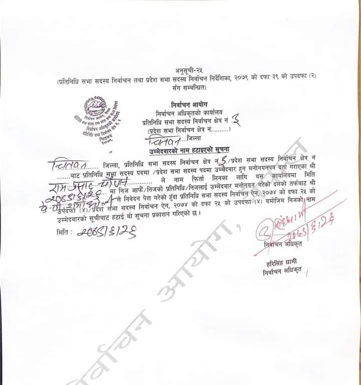 चितवन । आगामी मंसिर ४ गते हुने प्रतिनिधि सभाको चुनावका लागी उम्मेदवारी दिएका एमालेका रामप्रसाद न्यौपानेको उम्मेदवारी फिर्ता भएको छ ।