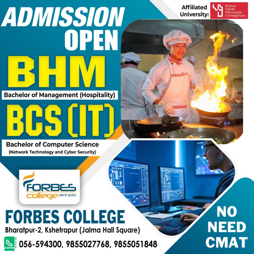 काठमाडौँ उपत्यका बाहिर फोर्ब्स कलेजले चितवनमा स्नातक तहमा साइबर सेक्युरिटी सम्बन्धि कार्यक्रम सञ्चालन गर्दै आएको छ । यस कलेजले विद्यार्थीलाई मात्र पढाउँदैन । प्रहरीलाई समेत बेला बेलामा साइबर सेक्युरिटी सम्बन्धि तालिम दिँदै आएको छ । पछिल्लो समय साइबर क्राइमका घटना बढ्दै जाँदा प्रहरीलाई नै टाउको दुखाईको विषय बनेको छ ।