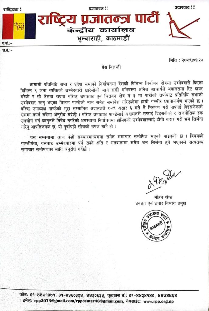 चितवन । अदालतबाट सफाइ पाइसकेको उमेदवारलाई दोषी करार गरि भ्रम सिर्जना गरिनु आपत्तिजनक भएको राष्ट्रिय प्रजातन्त्र पार्टीले बताएको छ । राप्रपाका प्रवक्ता मोहन श्रेष्ठले एक विज्ञप्ति जारी गरी पार्टी वरिष्ठ उपाध्यक्ष विक्रम पाण्डेको मुद्धा सर्वाेच्च अदालतले २०७९ असार ६ गते नै निरुपण गरी सफाइ दिइसकेकाले भ्रममा नपर्न अनुरोध गरेका छन् ।