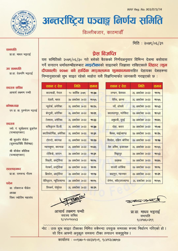 अन्तर्राष्ट्रिय पञ्चाङ्ग निर्णय समितिले आज सोमवार विज्ञप्ति निकालेर यस वर्षको तिहारको भाइटीकाको उत्तम साइत कात्तिक १० गते ११ बजेर ३७ मिनेटमा रहेको जनाएको हो । नेपालका लागि यो समय उपयुक्त भएको जनाएको हो ।