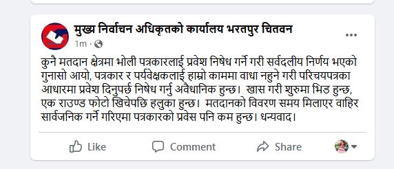 ‘कुनै मतदान क्षेत्रमा भोली पत्रकारलाई प्रवेश निषेध गर्ने गरी सर्वदलीय निर्णय भएको गुनासो आयो । पत्रकार र पर्यवेक्षकलाई हाम्रो काममा वाधा नहुने गरी परिचयपत्रका आधारमा प्रवेश दिनुपर्छ । निषेध गर्नु अवैधानिक हुन्छ। खास गरी शुरुमा भिड हुन्छ, एक राउण्ड फोटो खिचेपछि हलुका हुन्छ। मतदानको विवरण समय मिलाएर वाहिर सार्वजनिक गर्ने गरिएमा पत्रकारको प्रवेस पनि कम हुन्छ’, सूचनामा भनिएको छ ।
