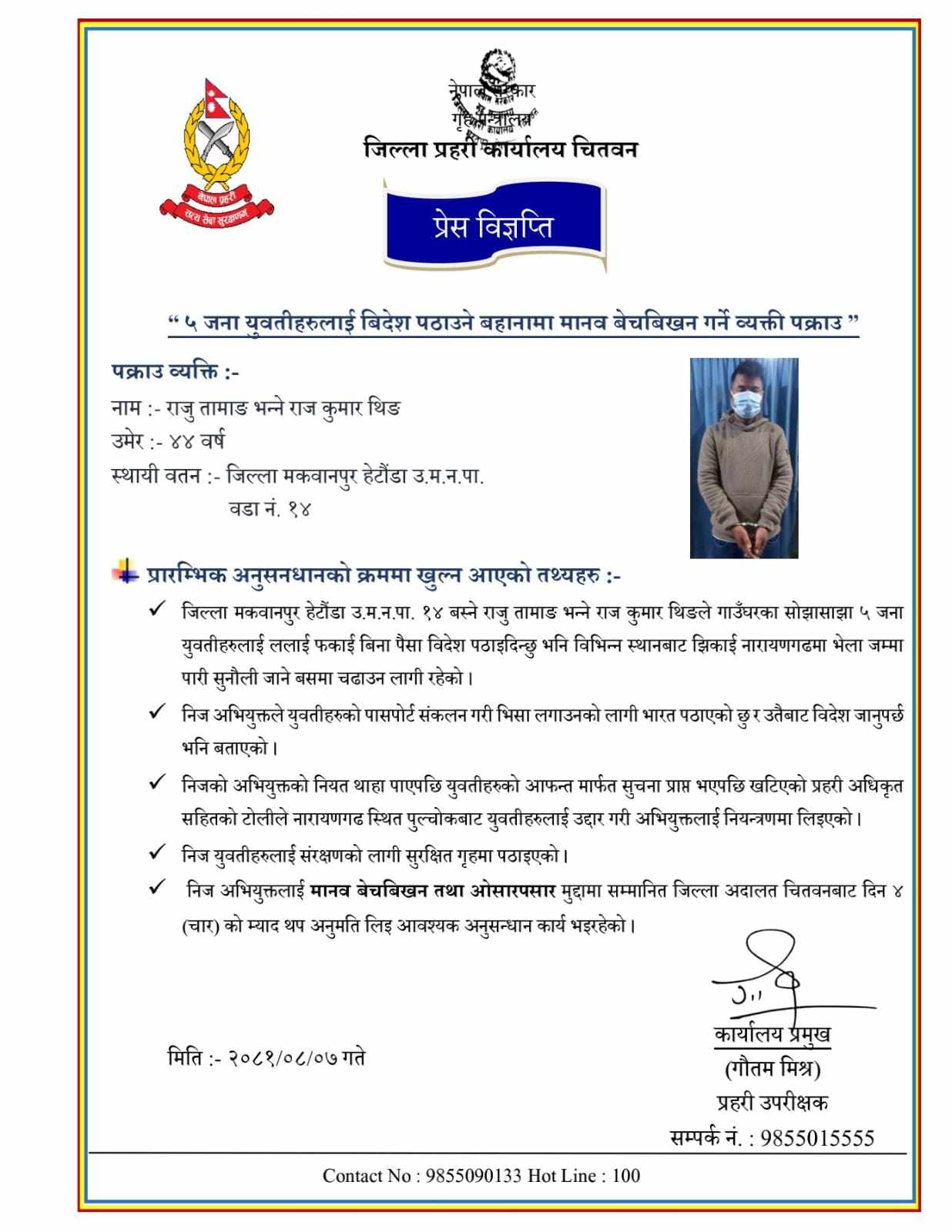 अभियुक्तले आफुहरुलाई बेच्न लैजान लागेको थाहा भएपछि युवतीहरुले आफन्तहरु मार्फत प्रहरीलाई खबर गरेका थिए । प्रहरीले नारायणगढको पुलचोकबाट युवतीहरुको उद्धार गरी अभियुक्तलाई नियन्त्रणमा लिएको हो ।