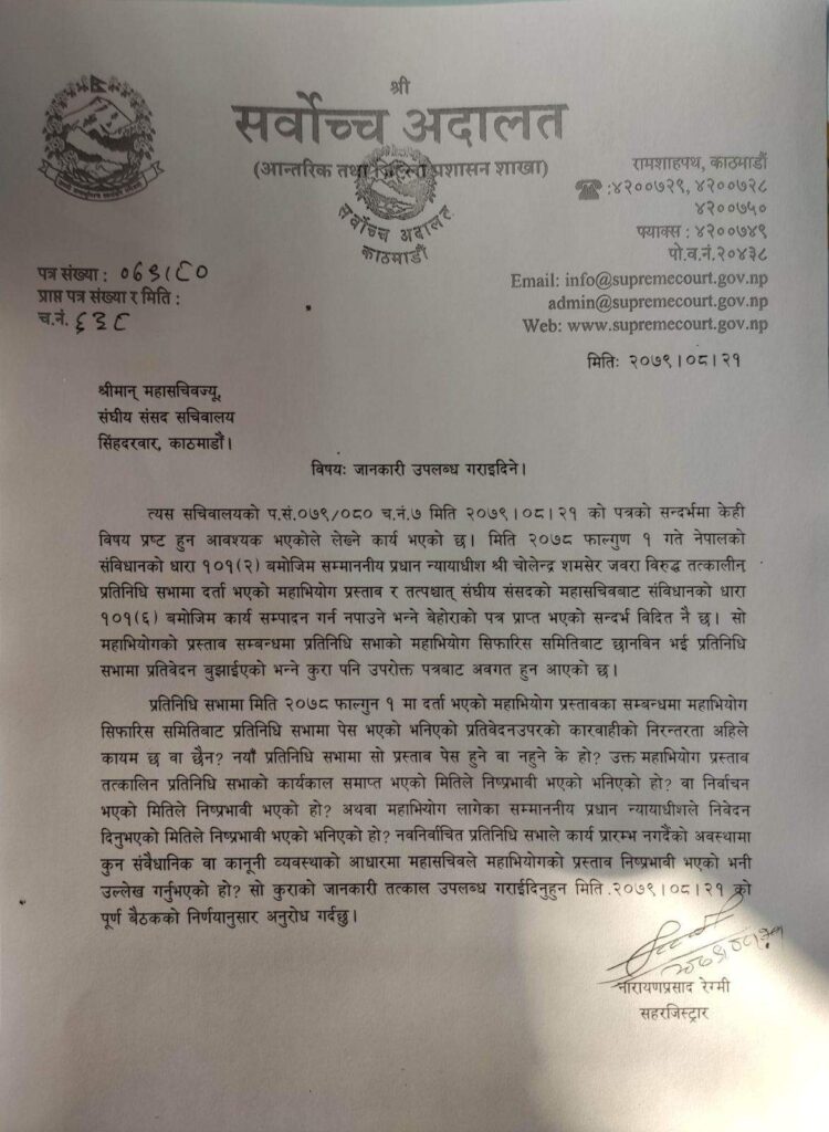 ‘२०७८ फागुन १ मा दर्ता भएको महाअभियोग प्रस्तावका सम्बन्धमा महाअभियोग सिफारिस समितिबाट प्रतिनिधिसभामा पेश भएको भनिएको प्रतिवेदन उपरको कारबाहीको निरन्तरता अहिले कायम छ वा छैन ?’ पत्रमा भनिएको छ, ‘नयाँ प्रतिनिधिसभामा सो प्रस्ताव पेश हुन्छ वा हुन्न? महाअभियोग प्रस्ताव तत्कालीन प्रतिनिधिसभाको कार्यकाल सम्माप्त भएको मितिले निष्प्रभावी भएको हो ? वा निर्वाचनको मितिले ? नवनिर्वाचित प्रतिनिधिसभाले कार्य प्रारम्भ नगर्दैको अवस्थामा कुन संवैधानिक वा कानुनी व्यवस्थाको आधारमा महासचिवले महाअभियोग निष्प्रभावी भएको भनि उल्लेख गर्नु भएको हो ?’