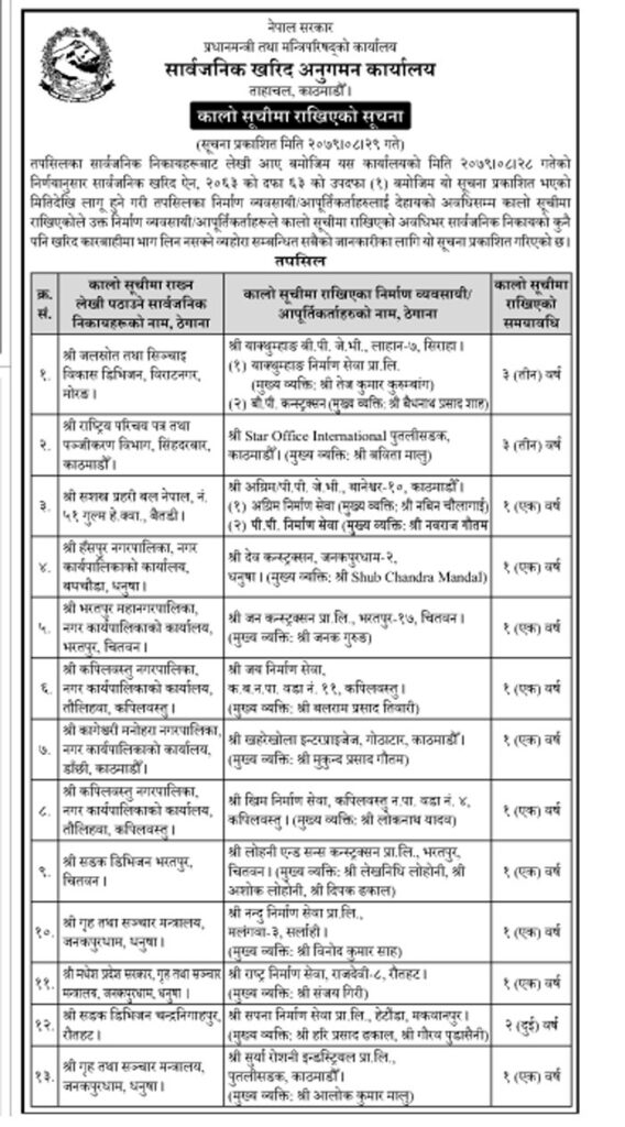 सिराहाको एक जेभीलाई तीन वर्ष र कपिलवस्तुका दुई, काठमाडौँ, जनकपुर,सर्लाही, रौतहत र मकवापुरका एक/एक ठेकेदार कम्पनी कालोसूचीमा परेका छन् । कालो सूचीमा राखिएको निर्माण व्यवसायी तथा आपूर्तिकर्ताहरूले कालो सूचीमा राखिएको अवधिभर सार्वजनिक निकायको कुनै पनि खरिद कारबाहीमा भाग लिन सक्ने छैनन् ।
