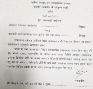 ‘यसमा के कसो भएको हो ? निवेदन मागबमोजिम अवहेलनामा सजाय किन नहुनुपर्ने हो ? सोको आधार, कारणसहित यो आदेश प्राप्त भएका मितिले बाटाका म्यादबाहेक सात दिनभित्र आफैं वा आफ्नो प्रतिनिधिमार्फत लिखित जवाफ पेस गर्नू भनी यो आदेश र निवेदनको प्रतिलिपी साथै राखी विपक्षका नाममा म्याद सूचना पठाई म्यादभित्र लिखित जवाफ परे वा अवधि नाघेपछि निमानुसार पेस गर्नू,’ आदेशमा भनिएको छ ।
