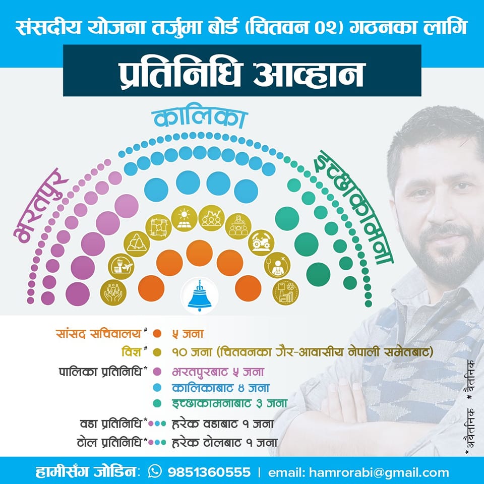 बोर्ड गठनको लागि उनले प्रतिनिधिहरु आह्वान पनि गरेका छन् । सांसद सचिवालयमा ५ जना, विज्ञ १० जना (चितवनका गैरआवासीय नेपालीसमेत), पालिका प्रतिनिधि (भरतपुरबाट ५, कालिकाबाट ४ र इच्छाकामनाबाट ३)जना आउन उनले आह्वान गरेका छन् ।