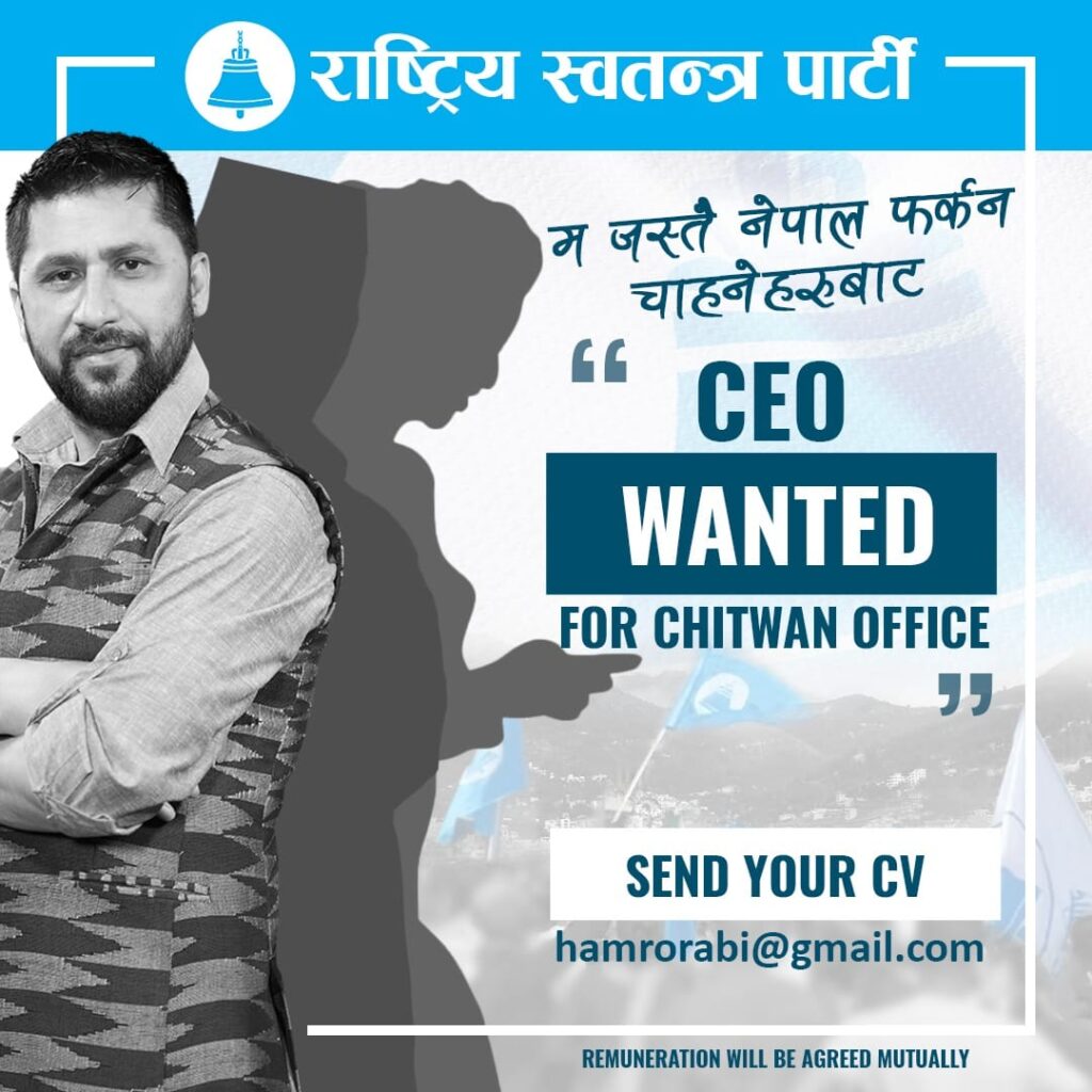 चितवन । राष्ट्रिय स्वतन्त्र पार्टीका सभापति एवम् चितवन २ बाट निर्वाचित सांसद रवि लामिछानेले विदेशमा रहेका नेपाली नागरिकलाई राम्रो जागिर दिएर स्वदेशमै फर्काउने योजनाको सुरुवात गरेका छन् । उनले शुक्रबार चितवन कार्यालयको लागि प्रमुख कार्यकारी अधिकृत (सिईओ) माग गरेका छन् ।