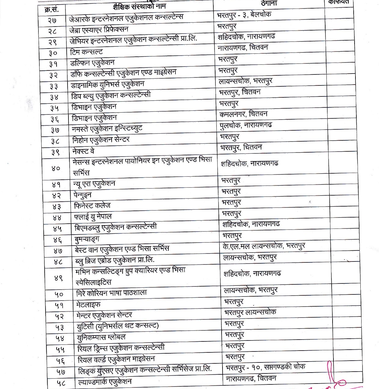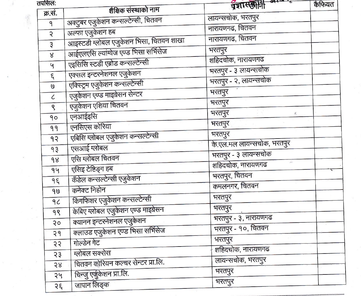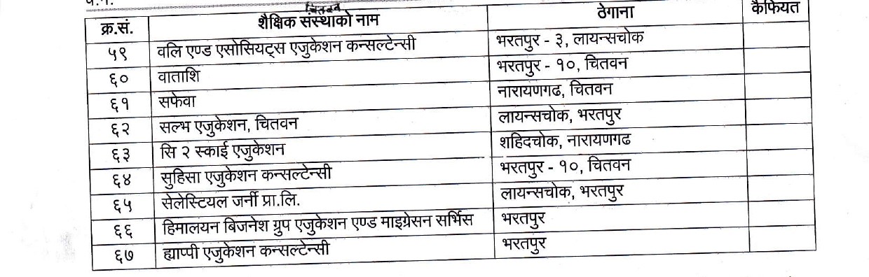 चितवन । चितवनका ६७ वटा शैक्षिक परामर्श तथा भाषा प्रशिक्षण दिने संस्था (कन्सलटेन्सी)हरु जिल्ला प्रशासन कार्यालयमा अझै सूचीकृत नभएको पाइएको छ ।