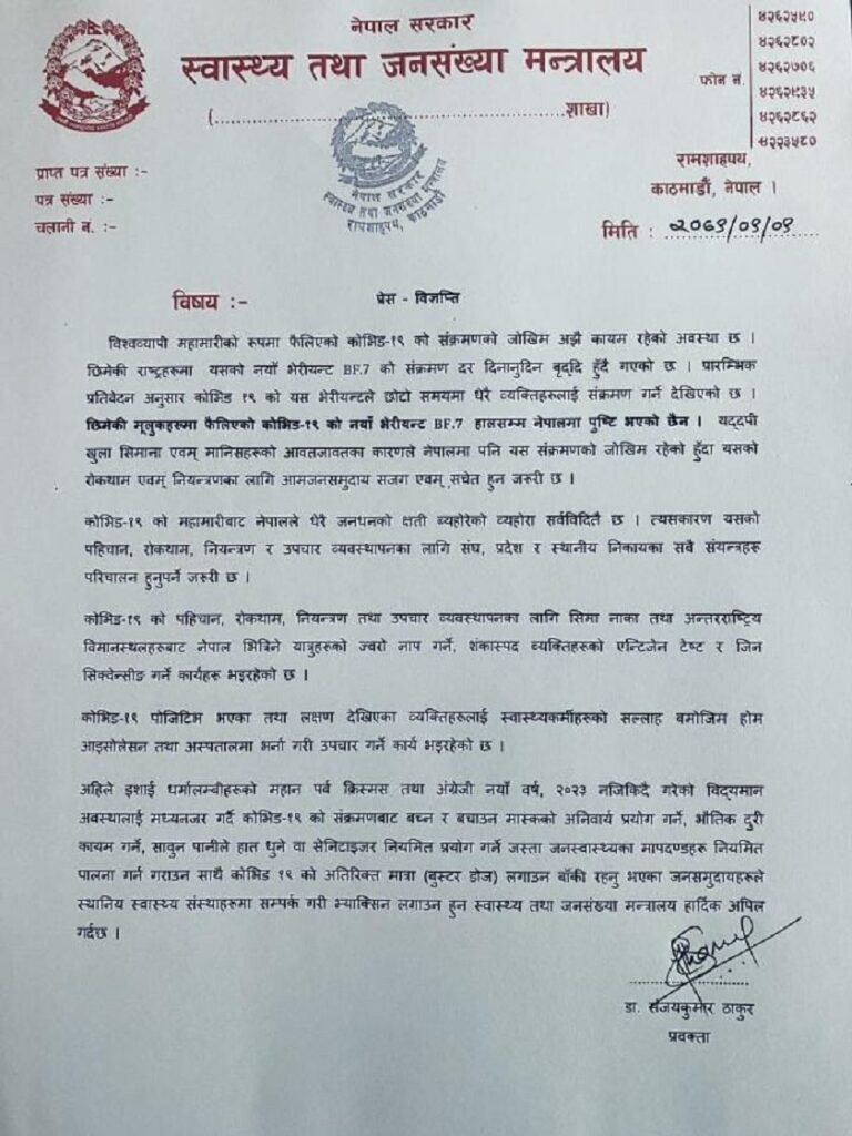 छिमेकी देशहरूमा कोभिड–१९ को नयाँ भेरियन्ट बीएफ–७ संक्रमण बढी रहेको र खुला सीमाका कारण नेपालमा पनि जोखिम रहेको मन्त्रालयले जानकारी दिएको छ ।
