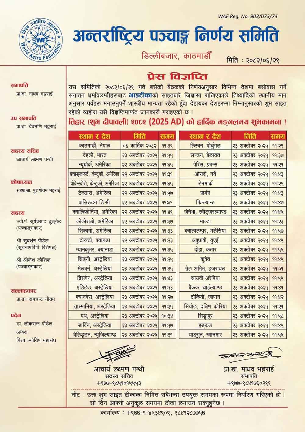 कात्तिक ३ गते सोमबार बिहान नरक स्नानसहित कुकुर तिहार र बेलुकी लक्ष्मीपूजा परेको छ । कात्तिक ३ गते सोमबार दिउँसो ०२:५२ बजेसम्म कात्तिक कृष्ण चतुर्दशी र त्यसपछि औंशी तिथि लाग्ने भएकाले शास्त्रसम्ममत् रूपमा पर्वसम्बन्धी निर्णय गरिएको समितिले जनाएको छ ।