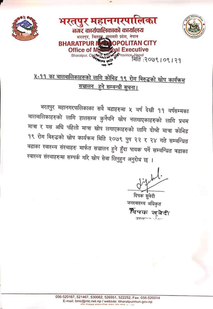 चितवन । भरतपुर महानगरपालिकामा ५–११ वर्ष उमेर समूहका बालबालिकालाई कोभिड–१९ विरुद्धको खोप लगाइने भएको छ ।