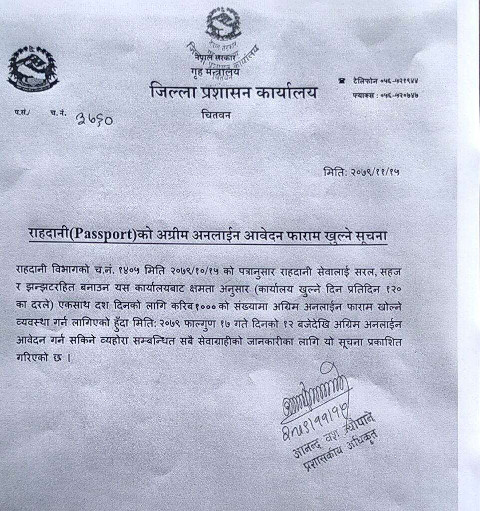चितवन । जिल्ला प्रशासन कार्यालय चितवनले राहदानीको अग्रिम अनलाईन आवेदन फागुन १७ गते दिउँसो १२ बजेदेखि खोल्ने भएको छ । प्रशासन कार्यालयले यसअघि एक महिनाको लागि तीन हजारको संख्यामा अनलाईन फारमको आवेदन खोलेको थियो ।