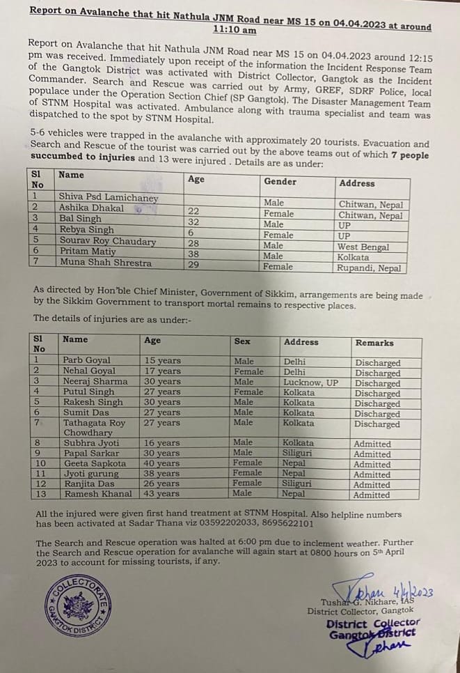 कालिका नगरपालिकाका मेयर विनोद रेग्मीले भ्रमण गएका दुई जनाको मृत्यु भएको र तीन जना घाइते भएको जानकारी दिए । हिँउमा फसेका नागरिकको उद्धार, मृतकको शव व्यवस्थापन र घाइतेको उपचारको लागि इलामका सिडिओ श्रवणकुमार पोखरेलसँग सहयोग मागेको उनले बताए । भ्रमण गएकाहरुसँग मेसेन्जरमार्फत कुरा भइरहेको उनले बताए ।