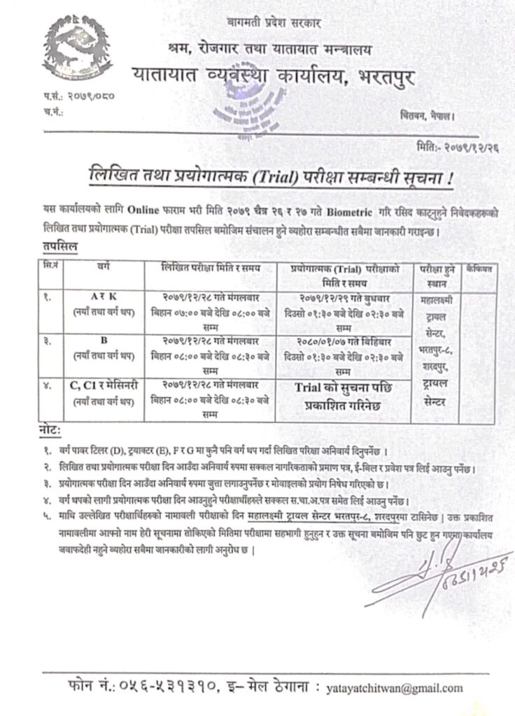 चितवन । यातायात व्यवस्था कार्यालय चितवनले सवारी चालक अनुमति पत्र (लाइसेन्स)को लागि आज पहिलो पटक वायोमेट्रिक लिएको छ । कार्यालयले भोलि पनि वायोमेट्रिक लिँदै छ । कार्यालयले चैत २८ गते लिखित परीक्षा र चैत २९ गते ट्रायल परीक्षा लिने भएको छ । लिखित र ट्रायल परीक्षा महालक्ष्मी ट्रायल सेन्टरमा हुने छ ।