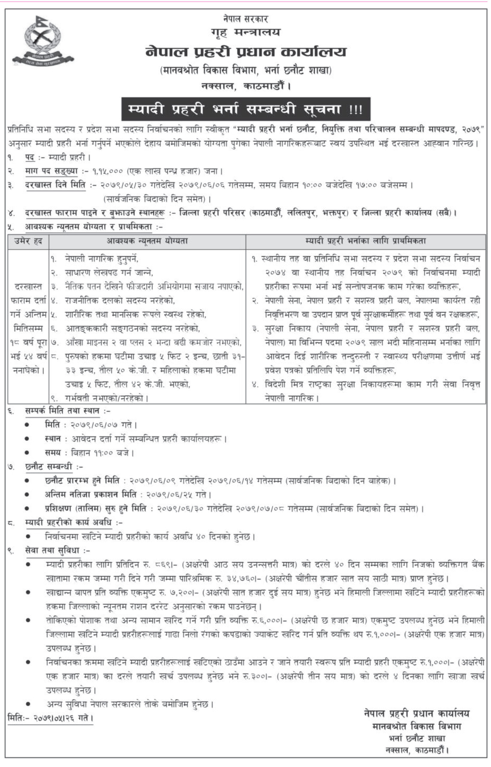 काठमाडौँ । मंसिर ४ गते हुन लागेको प्रतिनिधि सभा र प्रदेश सभा निर्वाचनको लागि नेपाल प्रहरीले म्यादी प्रहरीको लागि भर्ना खुला गरेको छ । प्रहरी प्रधान कार्यालय मानव श्रोत विकास विभागको भर्ना छनौट शाखाले म्यादी प्रहरी भर्ना छनौट, नियुक्ति तथा परिचालन सम्बन्धी मापदण्ड, २०७९ अनुसार १ लाख १५ हजार म्यादी प्रहरीका लागि दरखास्त आह्वान गरेको हो।