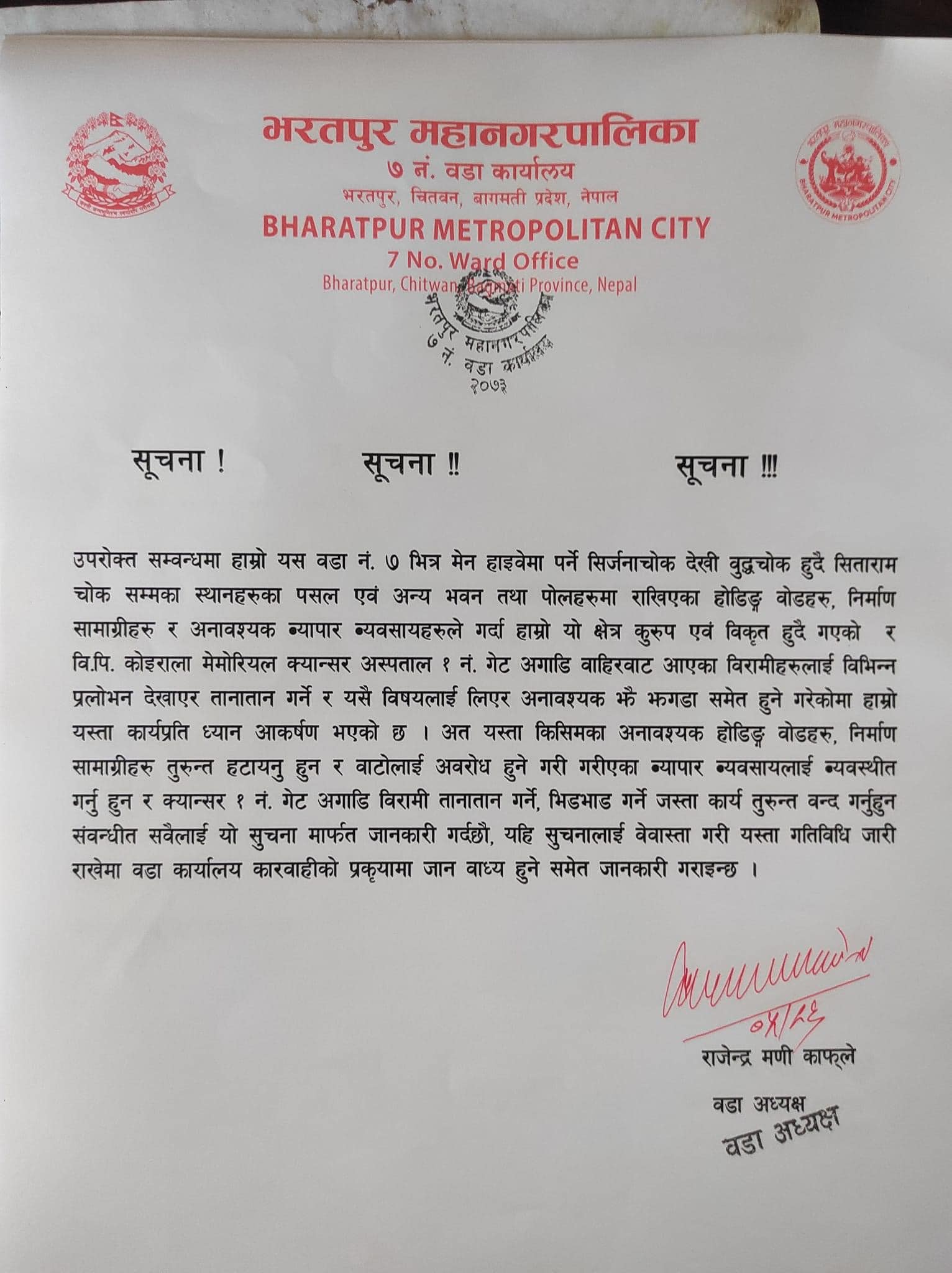 काफ्लेले एक सूचना जारी गरी विजुलीका पोलमा राखिएको होर्डिङ बोर्ड, बाटोलाई अवरोध हुनेगरी राखिएका निर्माण सामग्री र व्यवसाय तत्काल हटाउन निर्देशन दिएका हुन् । त्यस्तै, क्यान्सरका विरामीलाई विभिन्न प्रलोेभन देखाएर तानातान गर्ने र भिडभाड गर्ने जस्ता गतिविधि बन्द नगरे वडा कार्यालयले कारबाहीको प्रक्रियालाई अगाडि बढाउने काफ्लेले चेतावनी दिएका छन् ।